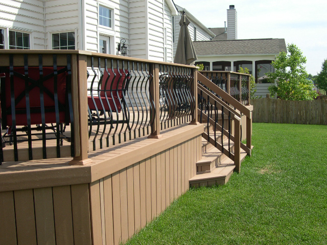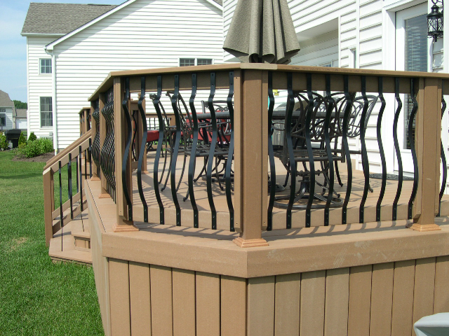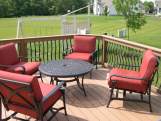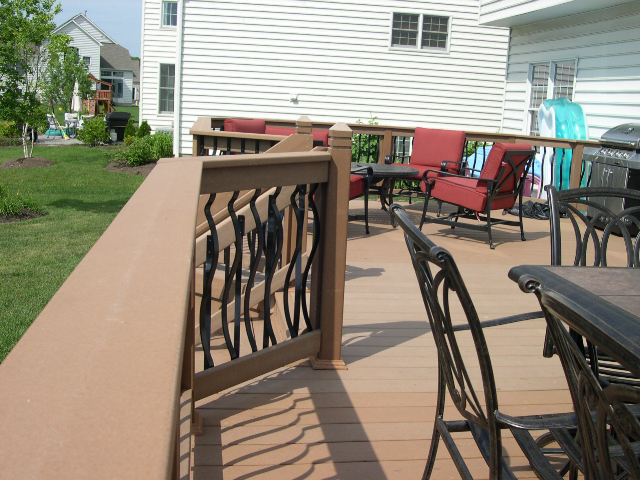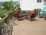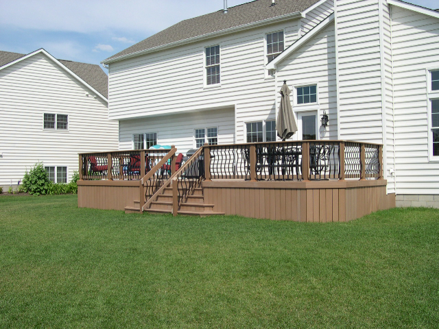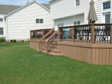 No basic square or rectangle decks here! With proper design planning, this deck maximizes the space available by integrating form and function on both sides of the job. This seating area shown ,is more than ample for a large table while the center of the deck offers plenty of room for extra chaises or a sandbox for the kids. The other end features a bay area for the grill, access to the rear door and a cascade stairway. All of our designs are built around you and your family's particular needs and they make great play-pens for the children. This keeps the house cleaner too!