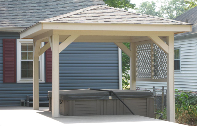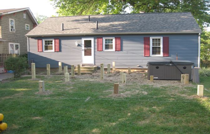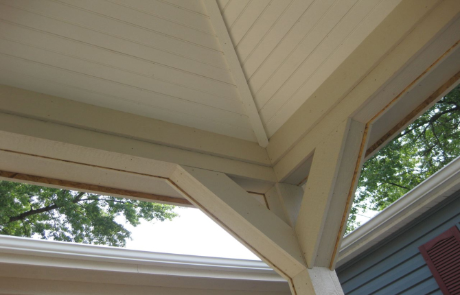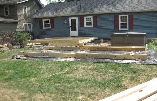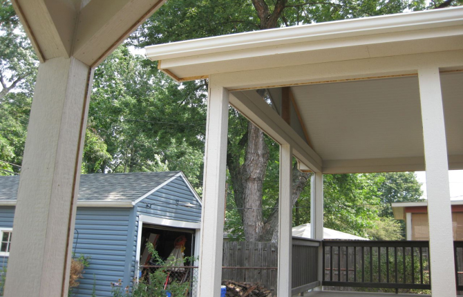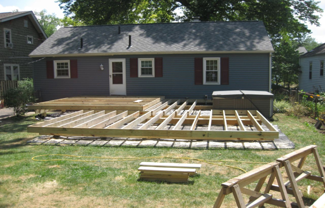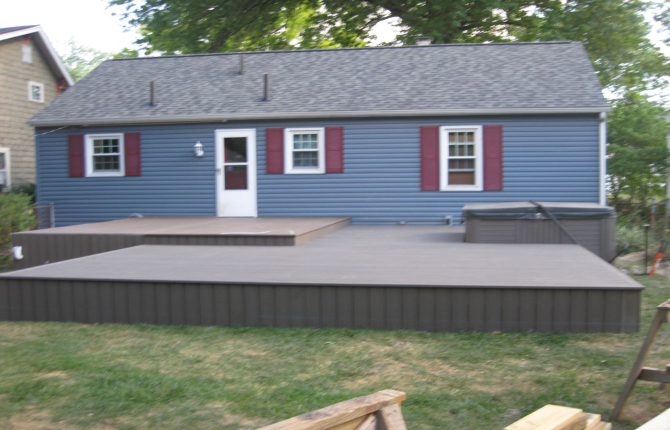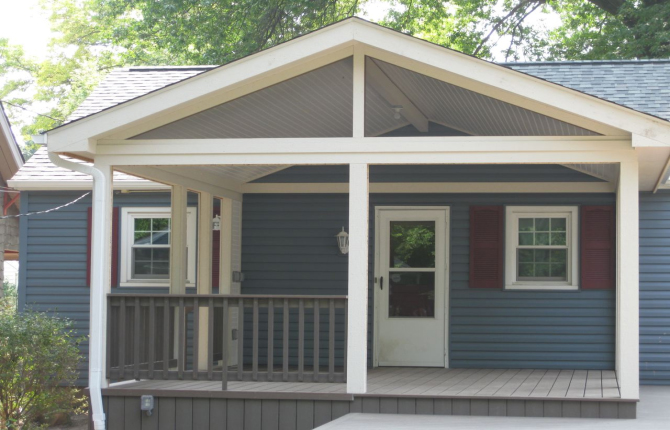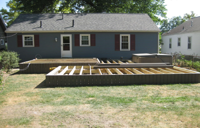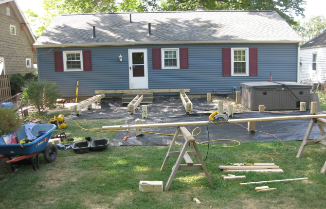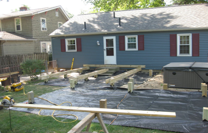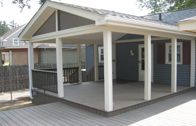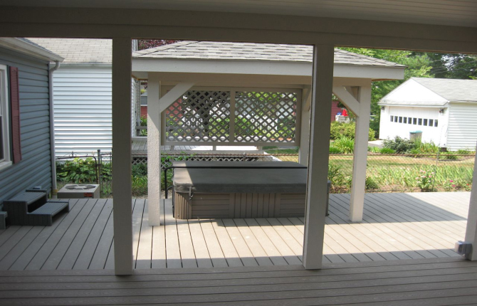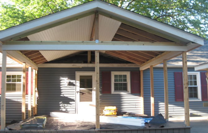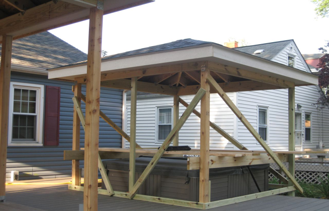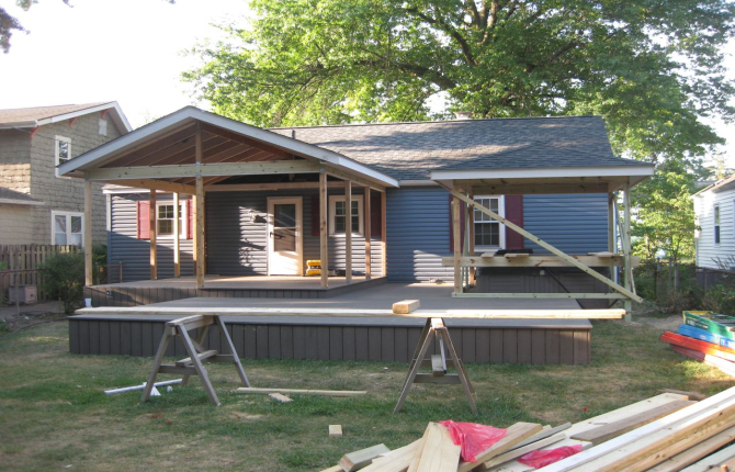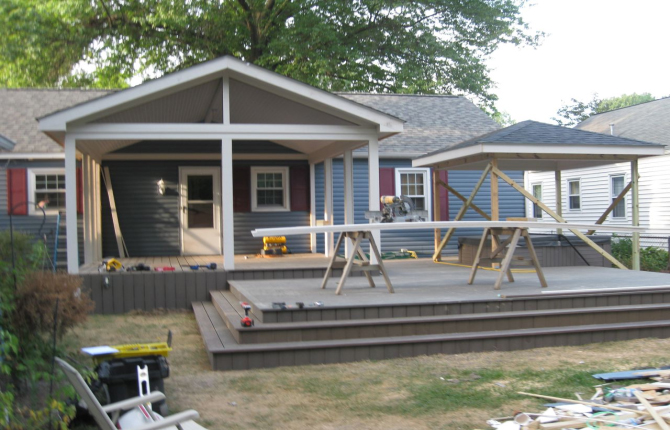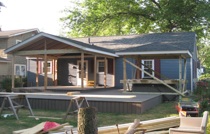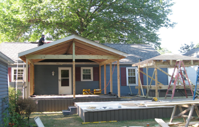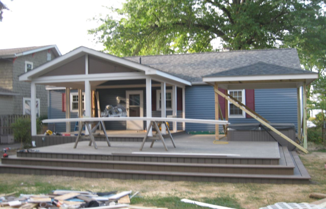 Watch this job progress over fourteen working days! The results are amazing. Features include an open porch with a large step-down deck and a true full hip roof over a sunken hot tub. The pictures not only show our precision heavy framing with 6x6 support posts but also custom cut rafters- no trusses! This insures quality from start to finish and how we organize a clean job site. The homeowner wanted a low maintenance project so we chose a composite deck in gray along with a hi tech no maintenance ceiling inside both roofs.